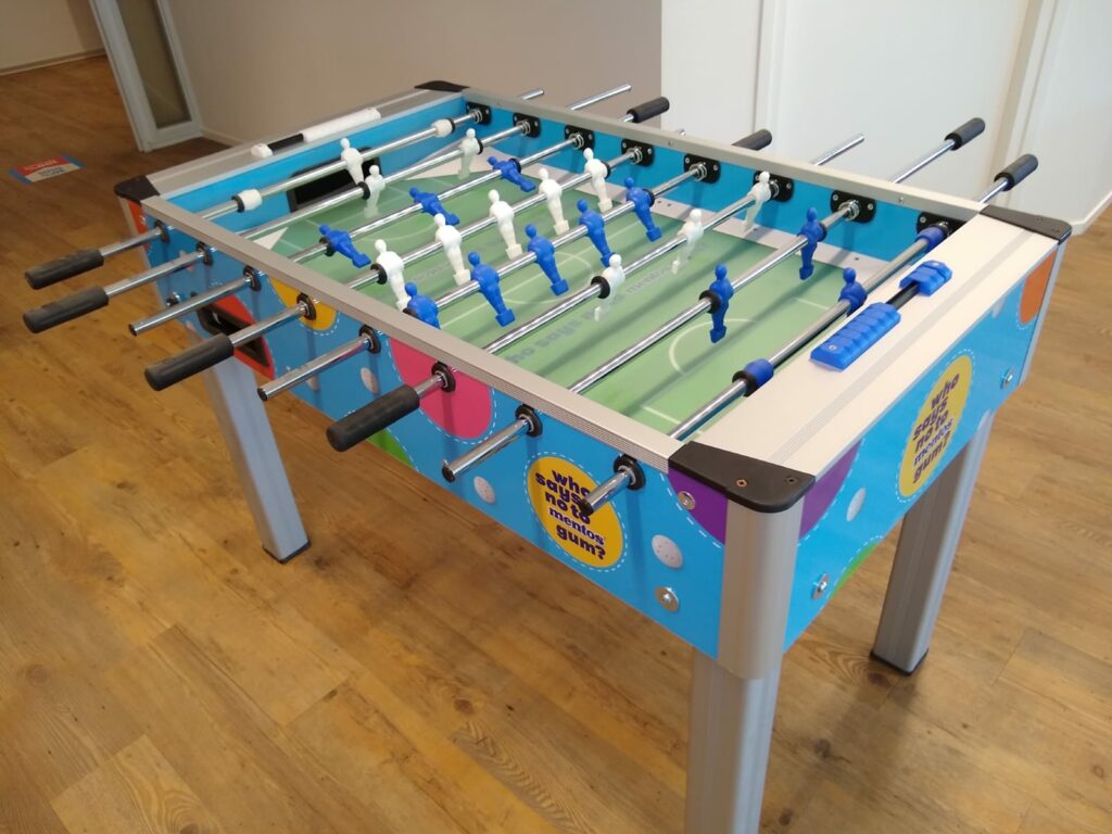 Deze Heemskerk voetbaltafel was uiteraard geheel in Mentos stijl gemaakt, compleet met een vrolijke print aan de buitenkant en blauwe en witte poppetjes.
