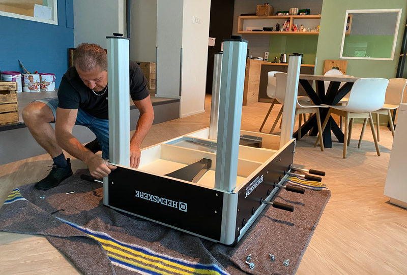 Nee, als je bij ons een speeltafel inclusief montage besteld, dan zal onze monteur deze in onze werkplaats monteren. De tafel wordt daarna speelklaar bij je afgeleverd. Lees meer informatie over de Heemskerk Montage Service.
